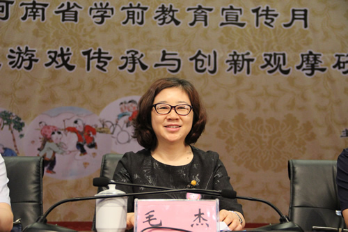 毛杰在开幕式上指出,游戏是幼儿的天性和基本权利,是幼儿特有的生活和学习方式,对幼儿的身心和谐发展具有独特的价值。今年全国学前教育宣传月活动的主题是“游戏——点亮快乐童年”,作为我省学前教育宣传月活动的一个重要组成部分,这次的观摩研讨活动就是要围绕“农村传统游戏传承与创新”这个主题进行观摩研讨。一是观摩郏县幼儿园在坚持以游戏为基本活动,创造机会和条件,让幼儿在自主快乐的游戏中学习成长方面开展的系列探索研究,给广大的农村幼儿园提供可资借鉴的经验。二是通过专家讲座及研讨交流,从专业角度引导各位思考作为幼儿园教师的专业使命,进而提升自身的专业能力,真正落实好幼儿园以游戏为基本活动的要求,推动科学保教工作再上新台阶。对于幼儿园教师来说,要想赢得家长和社会的真正认可和尊重,不是会教拼音、识字、算数就可以了,而是要能够创造充足的游戏机会和游戏条件,能够科学的组织并实施游戏化课程,让孩子们真正在自主的游戏中激发想象和创造,发展语言表达和运动协调能力,探索、思考、学习解决问题,学会合作与交往,促进身心全面和谐发展。