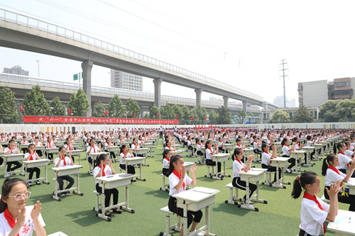 在郑州市金水区文化路第三小学,徐济超、钱国玉一行现场观看了学校墨香书法展示主题活动,参观了庆“六一”全省中小学师生“红心向党”墨香书法作品展。徐济超、钱国玉一行还观看了少先队员入队仪式。仪式上,少先队员们为省领导敬献了红领巾。