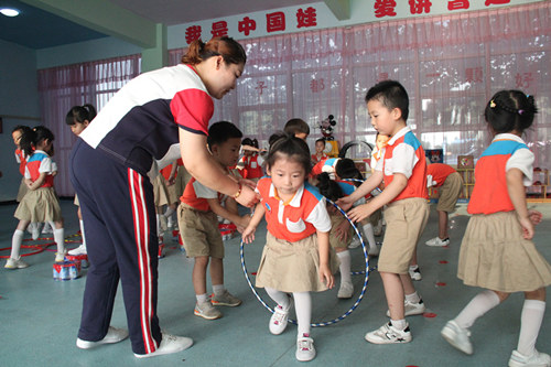 在民权县幼儿园,孩子们用老师制作的器材玩游戏